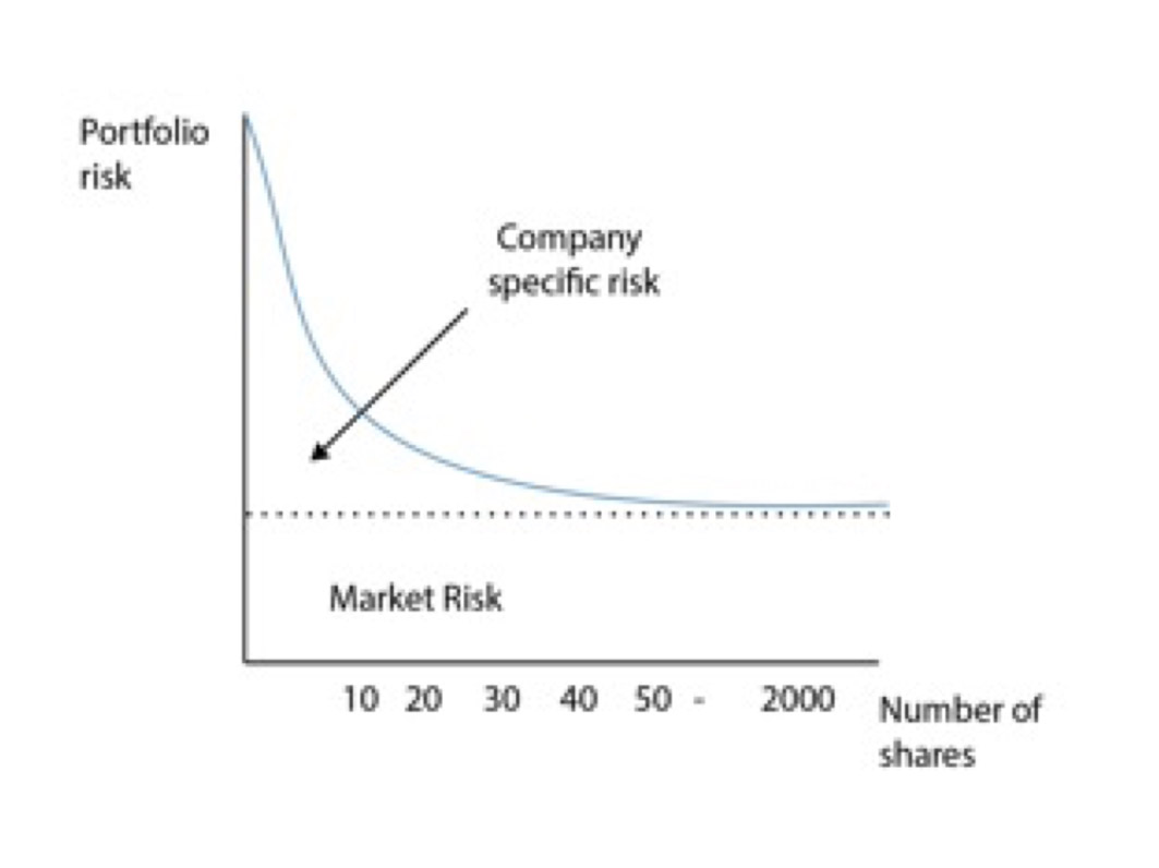 Of course, by increasing the number of shares in your portfolio you can diversify away company specific risk. But market risk remains regardless of how many shares you invest in.