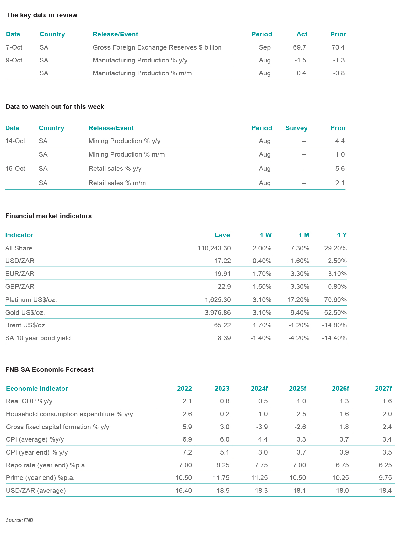 SA's gross foreign exchange reserves decreased from $70.4 billion in August to $69.7 billion in September. While gold reserves continued to climb, supported by the increase in the dollar-denominated gold price, and Special Drawing Right (SDR) holdings increased, foreign exchange reserves fell. The overall external liquidity position reflected the balance between a $474.6 million loan from the African Development Bank that was countered by a $2 billion loan repayment, asset price movements, as well as foreign exchange swaps conducted for liquidity management purposes.