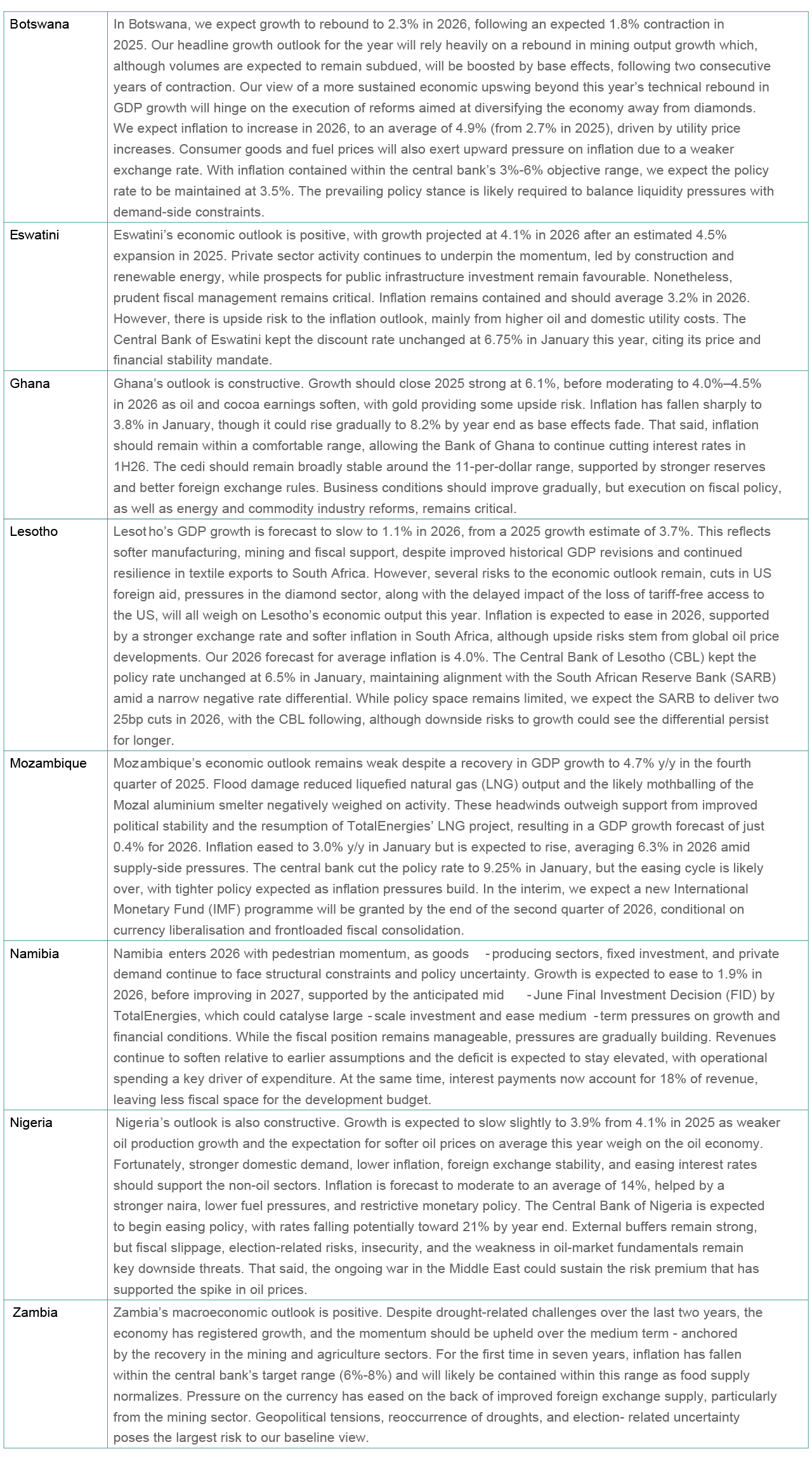 FirstRand Group has a presence in several other African countries and conducts extensive research into these economies. As part of our thought leadership, we will include our views on Botswana, Eswatini, Ghana, Lesotho, Mozambique, Namibia, Nigeria, and Zambia in this publication. Below is a summary of our medium-term outlook, where most countries are undergoing broad macroeconomic rebalancing. As structural reforms and fiscal consolidation improve, the operating environment and crowd-in private sector participation, asset and currency valuations should be supported, and inflation should remain within a comfortable range. This should allow monetary policy neutrality and uphold conducive financial conditions. That said, we worry about the adverse risks presented by ongoing geopolitical and trade tensions, destructive weather conditions, as well as political uncertainty and policy execution failures.