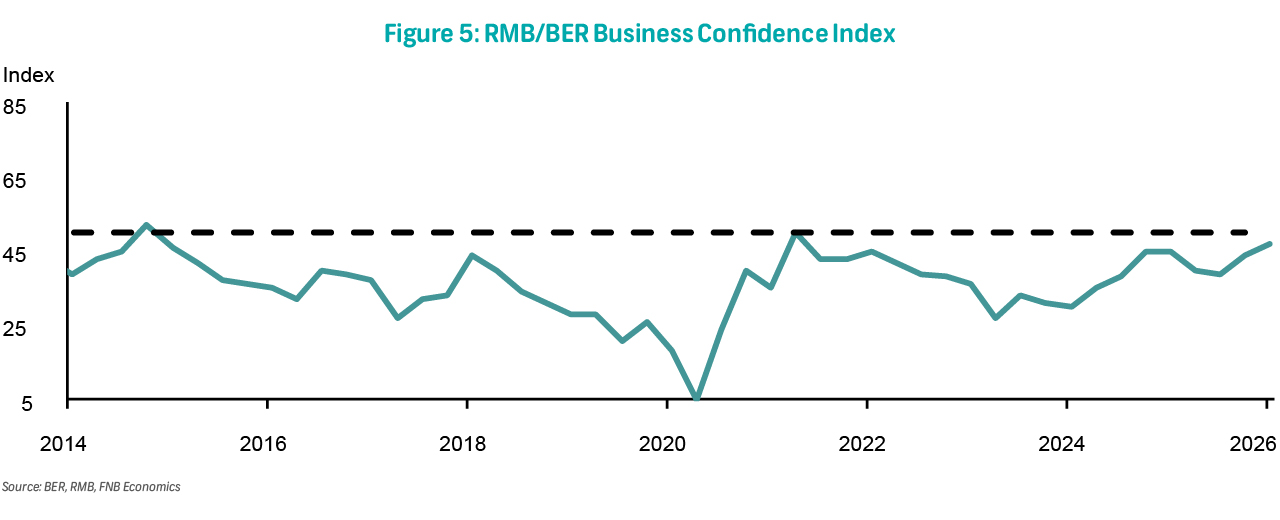 The RMB/BER Business Confidence Index (BCI) rose to 47 index points in 1Q26, up from 44 in the previous quarter. While confidence improved modestly, the index remains below the neutral 50-point mark. Sentiment strengthened among building contractors and new vehicle dealers, supported by interest rate cuts and resilient demand in more budget-friendly segments. By contrast, retail and manufacturing confidence declined. Composite indicators suggest that the economy is moving out of contractionary territory, although the recovery remains fragile.