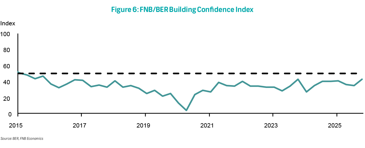 On Monday, the FNB/BER Building Confidence Index for 1Q26 will be available. The index rose to 43 index points in 4Q25, up from 35 previously. The index was at its highest in ten years but still reflected broader dissatisfaction with prevailing business conditions. While work among main contractors, architects, and hardware retail sales improved, activity declined among sub-contractors and quantity surveyors.