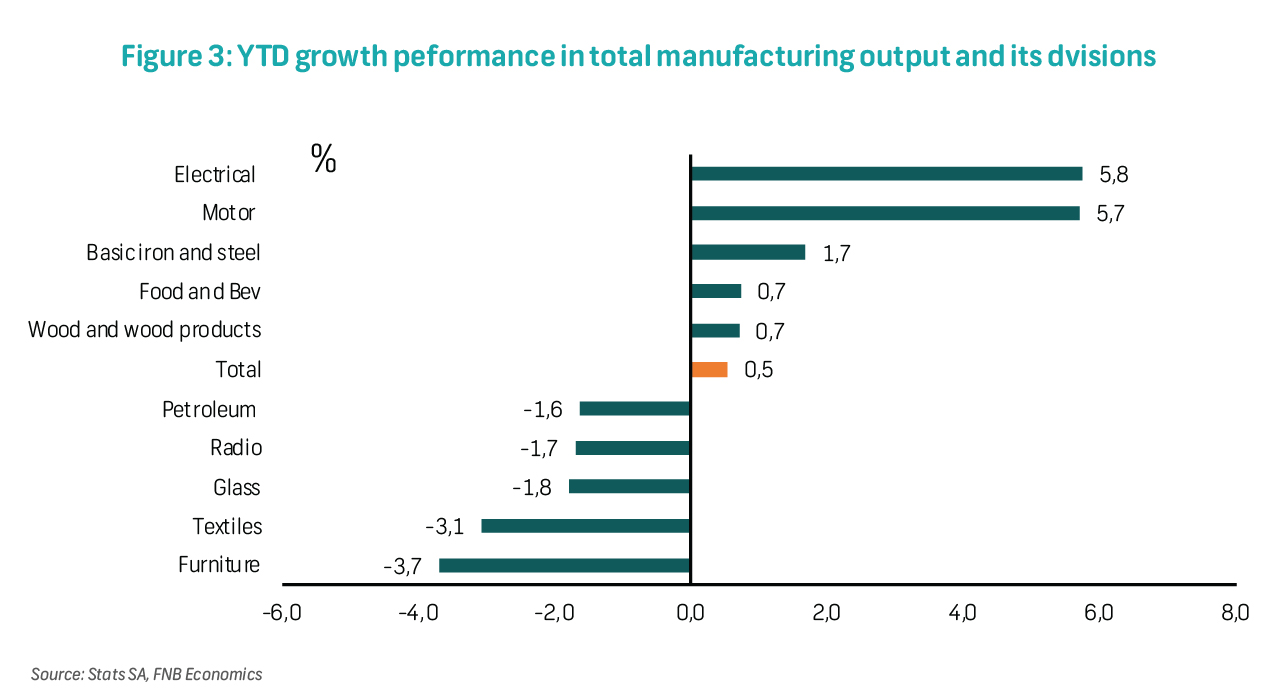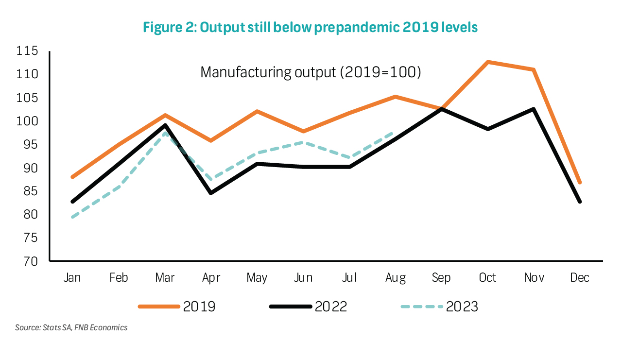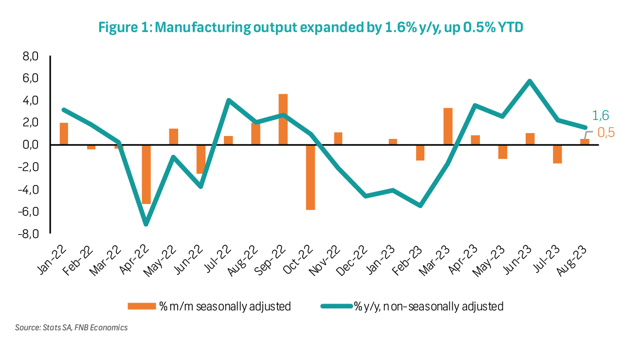 Manufacturing output is still on track to show slight growth in 2023, having expanded by 0.5% YTD (January-August) after declining by 0.3% in 2022. This is despite the challenges of load-shedding costs, weaker demand, and global trade. The automotive sector (up 5.7% YTD) has contributed the most to the growth performance in total manufacturing output, followed by the basic iron and steel division (up 1.7% YTD), wood and wood products division (up 0.7% YTD), and food and beverages division, which is also up 0.7% YTD. Although the latest PMI reading points to weaker activity at the end of the third quarter, manufacturers were optimistic about near-term operating business conditions. Beyond this year, lower levels of load-shedding and a modest recovery in demand should underpin growth in the sector. We are, however, still concerned about the logistics challenges, which, combined with load-shedding, have been a binding constraint on economic activity.