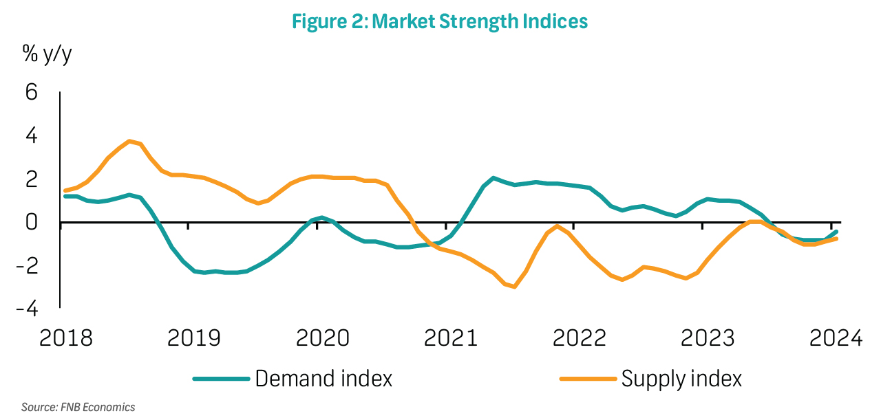 The FNB House Price Index growth averaged 0.6% y/y in January, unchanged from December, which was revised from 0.8% (Figure 1). The sideways movement house price appreciation is consistent with our view that price growth bottomed in 4Q23, but that a discernible upward trend should commence in 2H24, once affordability improves. Market strength indicators suggest that both demand and supply of properties for sale are contracting, and by a similar magnitude (Figure 2). Below, we outline what to expect in the residential property market in 2024.