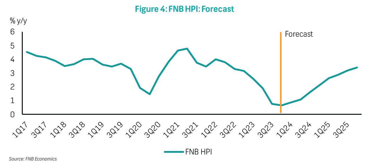 From a valuations' perspective, the subdued house price growth trajectory is likely to persist for a little while, until the lagged impact of lower inflation and borrowing costs filters through, from late 2024 to early 2025. In the longer term, price growth will be supported by improved GDP growth, and a combination of stronger demand for housing and improved structural affordability, following the persistent real house price correction since the GFC. We expect the FNB House Price Index (HPI) to average 1.4% this year, relatively unchanged from the 1.5% in 2023, before lifting to 3.0% in 2025 (Figure 4).