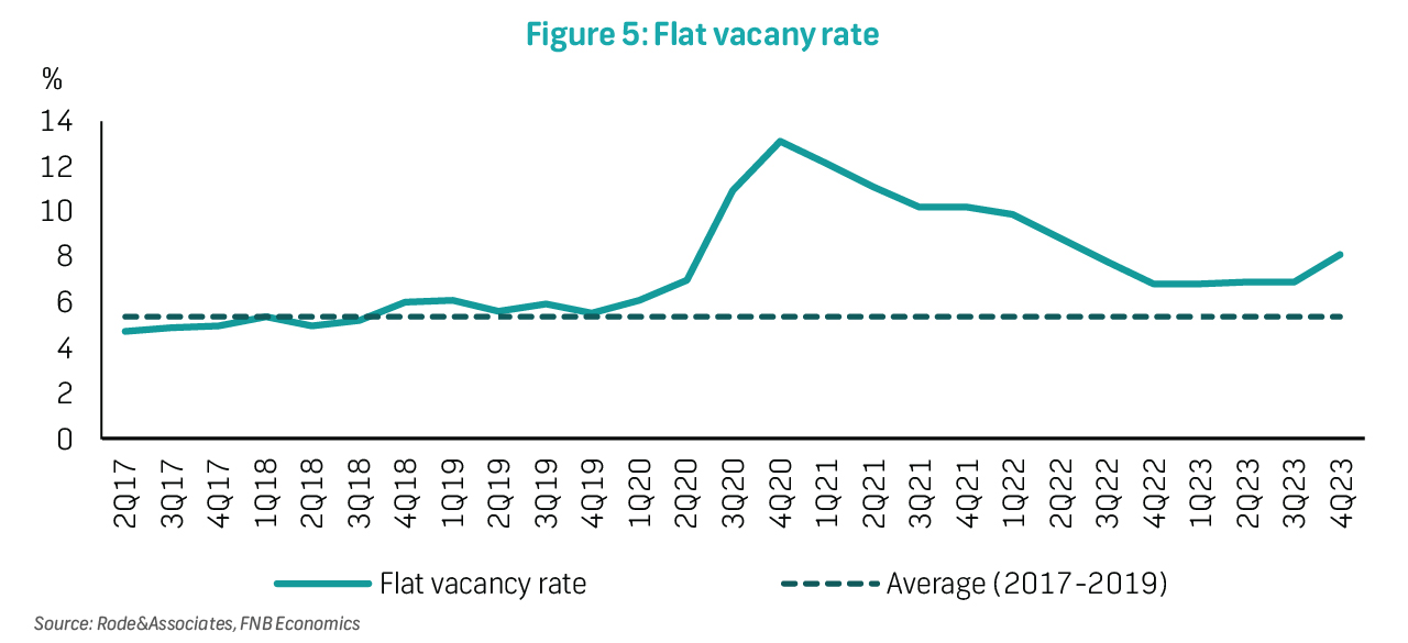 Following above-trend transaction activity between 2H20 and 2022, demand for residential property is expected to have reached its nadir in 2023. Available data suggests that mortgage volumes have declined by 28% to date, as affordability pressures kept prospective buyers at bay, and others seeking cheaper properties, as reflected by the compression in average loan sizes. Similarly, data suggests that house price growth may also have reached its trough in 4Q23, the lowest level since the Global Financial Crisis (GFC). Nevertheless, lower-priced segments outperformed, reflecting the buying-down effect and the persistent supply deficiencies. Meanwhile some high value segments, particularly in regions along the Western Cape coast, gained support from the semi-gration trend which now seems to be normalising.