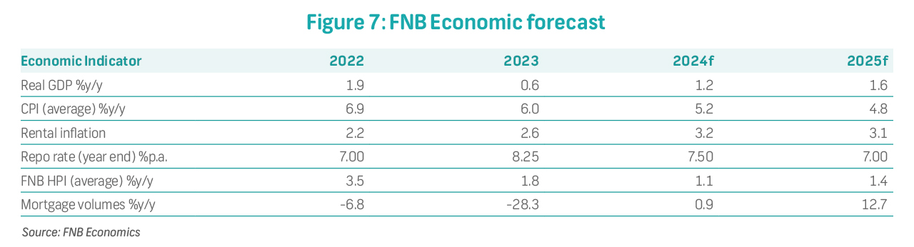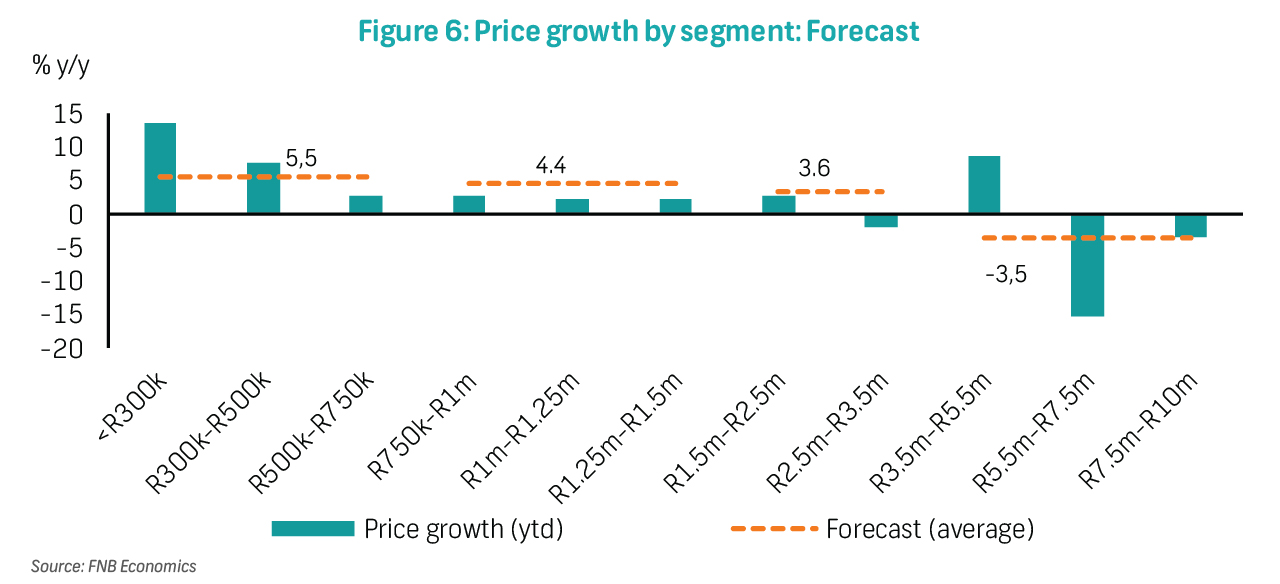 Affluent markets: After a productive 2021 and 2022, marked by favourable pricing, a robust recovery in non-labour income, improved balance sheets in the aftermath of the pandemic, and the rise of remote work, buying activity declined sharply in 2023, weighing on property values. The semi-gration trend is also normalising, providing less support to high-end property demand in coastal towns. On the positive side, sales related to emigration have slowed, and anecdotal evidence suggests an increase, albeit from very low levels, in South African expats buying local property in higher-priced segments. Ultimately, sentiment will be an important determinant of market outcomes, and subject to event risks such as the February Budget and National Election outcomes. We expect volumes to move relatively sideways this year, and a price growth trajectory with a mild negative bias (Figure 6).