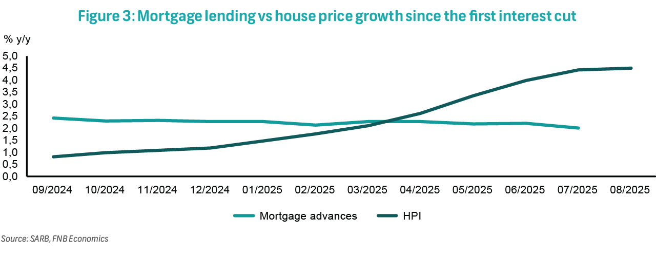 Despite improving demand and rising prices, mortgage lending remains subdued, indicating that the recovery is not yet credit driven. According to South African Reserve Bank (SARB) data, outstanding mortgage balances grew only 2.0% y/y in July, a rate that has remained in a narrow range for several months (Figure 3). This reflects a muted expansion in housing credit, suggesting that banks are not significantly increasing new mortgage lending, and/or consumers are cautious about taking on more housing debt. Either way, credit prudence continues to dominate.