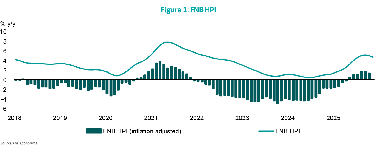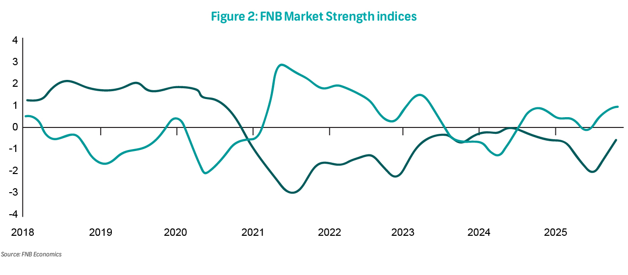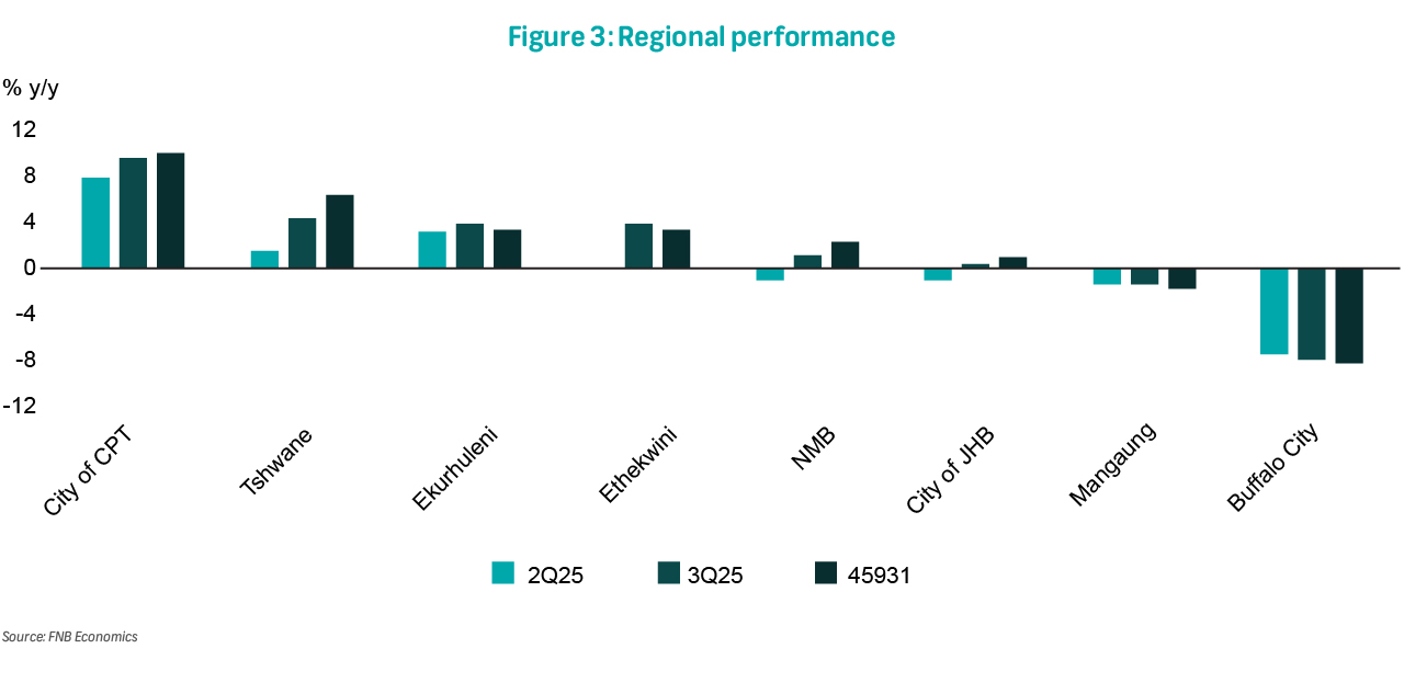 The FNB House Price Index (HPI) decelerated lightly to 4.9% y/y in October, down from a revised 5.1% in September (previously 4.9%) (Figure 1). Month-on-month, prices increased by 0.1%, down from 0.4% and 0.5% in September and August, respectively, signalling that the upward momentum is slowing. Our internal market strength indicators suggest that while recent interest rate cuts have helped revive demand, constrained property supply appears to be the primary force driving the current upward price growth (Figure 2). By metropolitans, property prices are performing strongly in Cape Town and Tshwane, supported by relatively favourable demand-supply dynamics, while Mangaung and Buffalo City are under pressure, with the latter likely reflecting the impact of a frail local manufacturing sector (Figure 3).