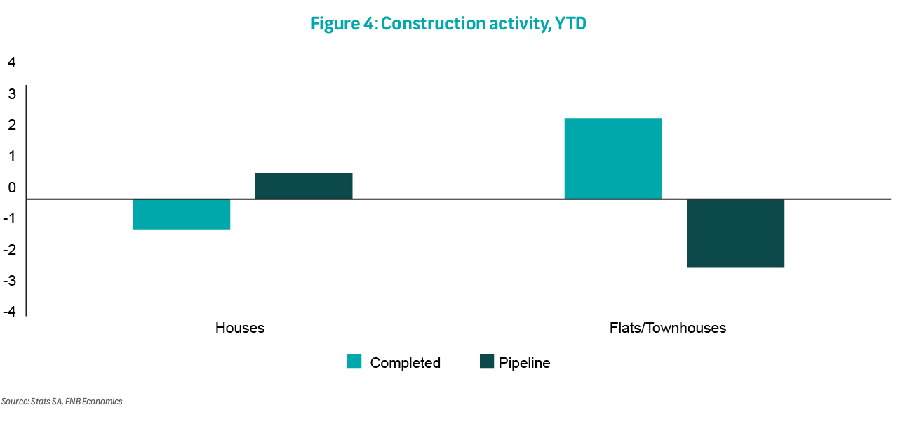 The upward trend in the supply of flats and townhouses persists, although much of this is due to base effects, following sustained decline in recent years. Year-to-date, supply of new flats and townhouses are up 21.8% compared to the same period last year, while volume of houses is down by 7.3%. Pipeline supply remains weak. Year-to-date, building plans approved by municipalities for housing units is down 5.7%, with flats and townhouses down 18.2% (Figure 4). This implies that the recovery in the current supply of flats and townhouses is not likely to endure. Overall, current and projected supply dynamics support our view of a broader residential price upcycle, underpinned by easing inflation, lower borrowing costs, and modest real wage gains.