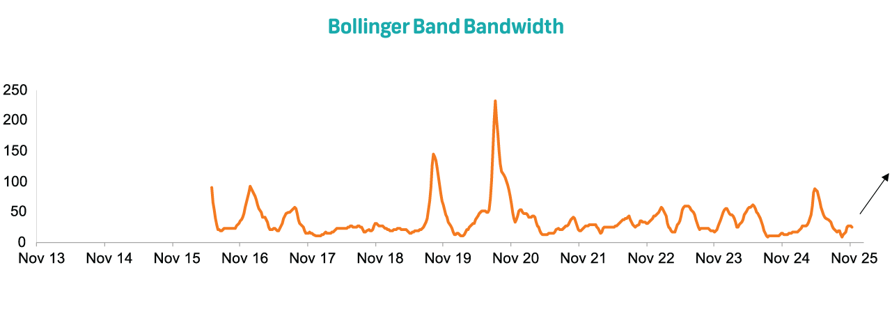 | Comment | The current low-volatility phase suggests stability and potential accumulation. Holding above the 200-day SMA with easing downside momentum, we maintain a profit target of R157.00, and a trailing stop at R127.00. | Price action remains well within the upward-sloping linear regression channel. Although below the 200-day SMA and positioned as a counter-trend trade, fading downside momentum supports the setup. We maintain a profit target of R1 255.00, with a trailing stop at R990.00. | Price action within a well-defined upward channel remains of interest. The share is holding slightly above its 200-day SMA, though fading upside momentum is a concern for the trade setup. We maintain a profit target of R312.00, with a trailing stop at R269.00. |