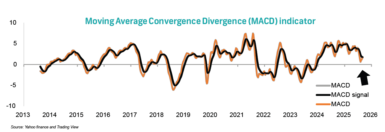 • The lower panel shows occurrence of the MACD indicator. The bullish crossover occurs when the MACD line crosses above its signal line, highlighting a shift in momentum from negative to positive. This pattern offers valuable confirmation of trend reversals or the early stages of new upward movements.