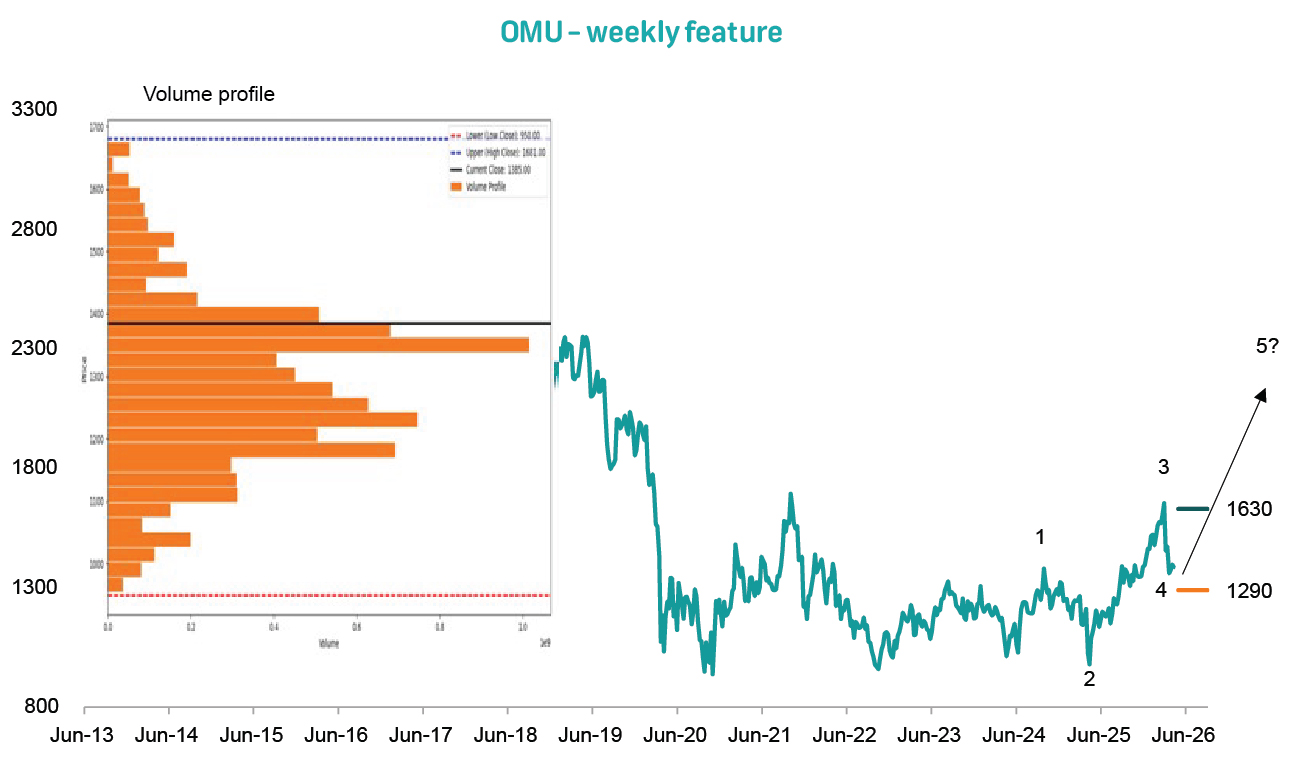 A supportive volume profile also underpins a constructive outlook, with a high volume node just below the current price acting as a strong area of value and support (see the insert on the main chart).